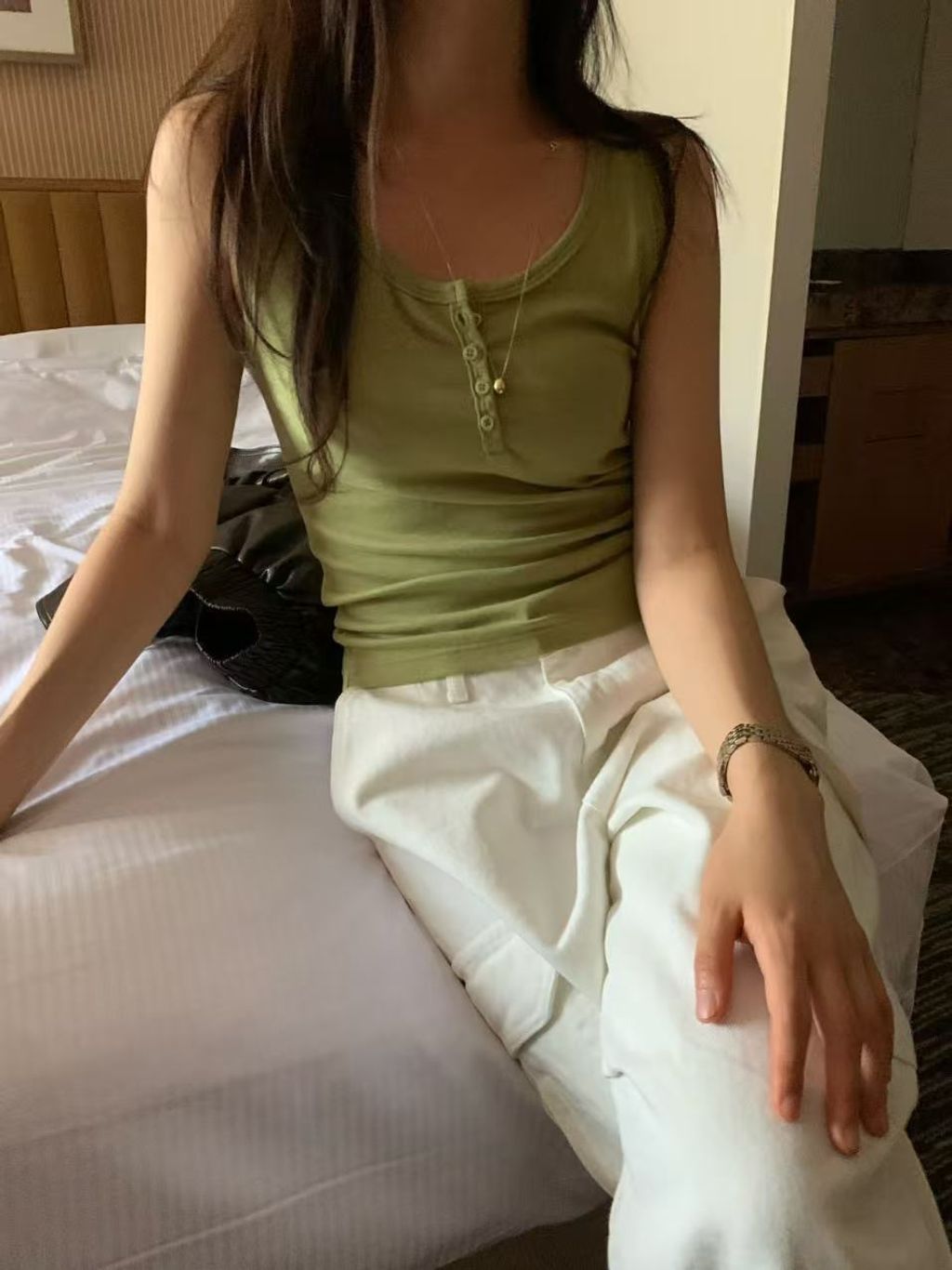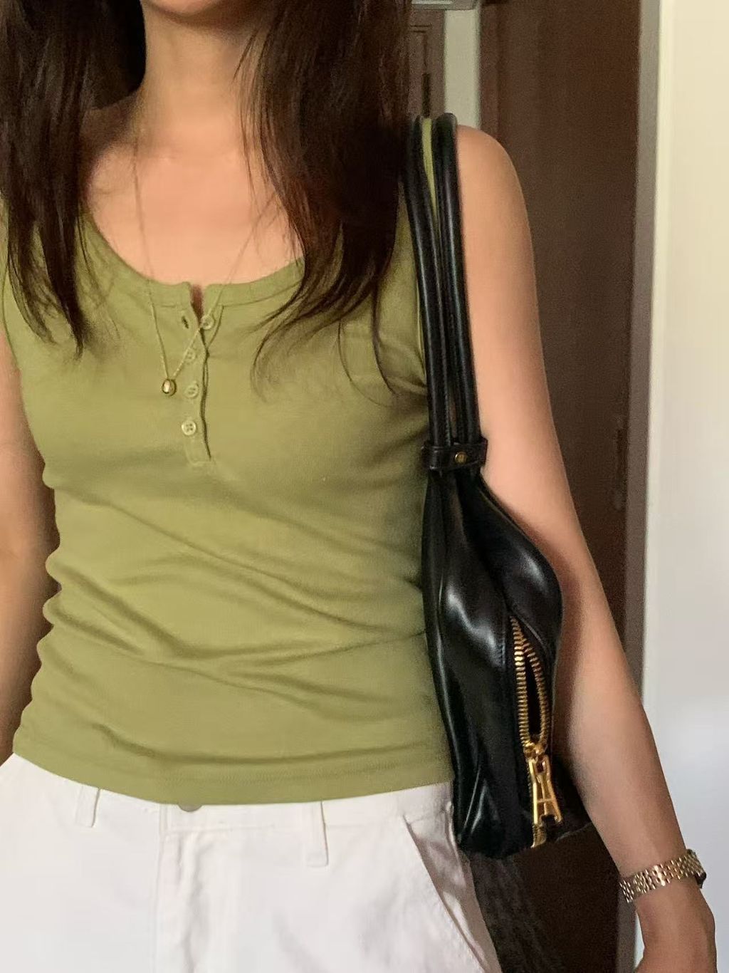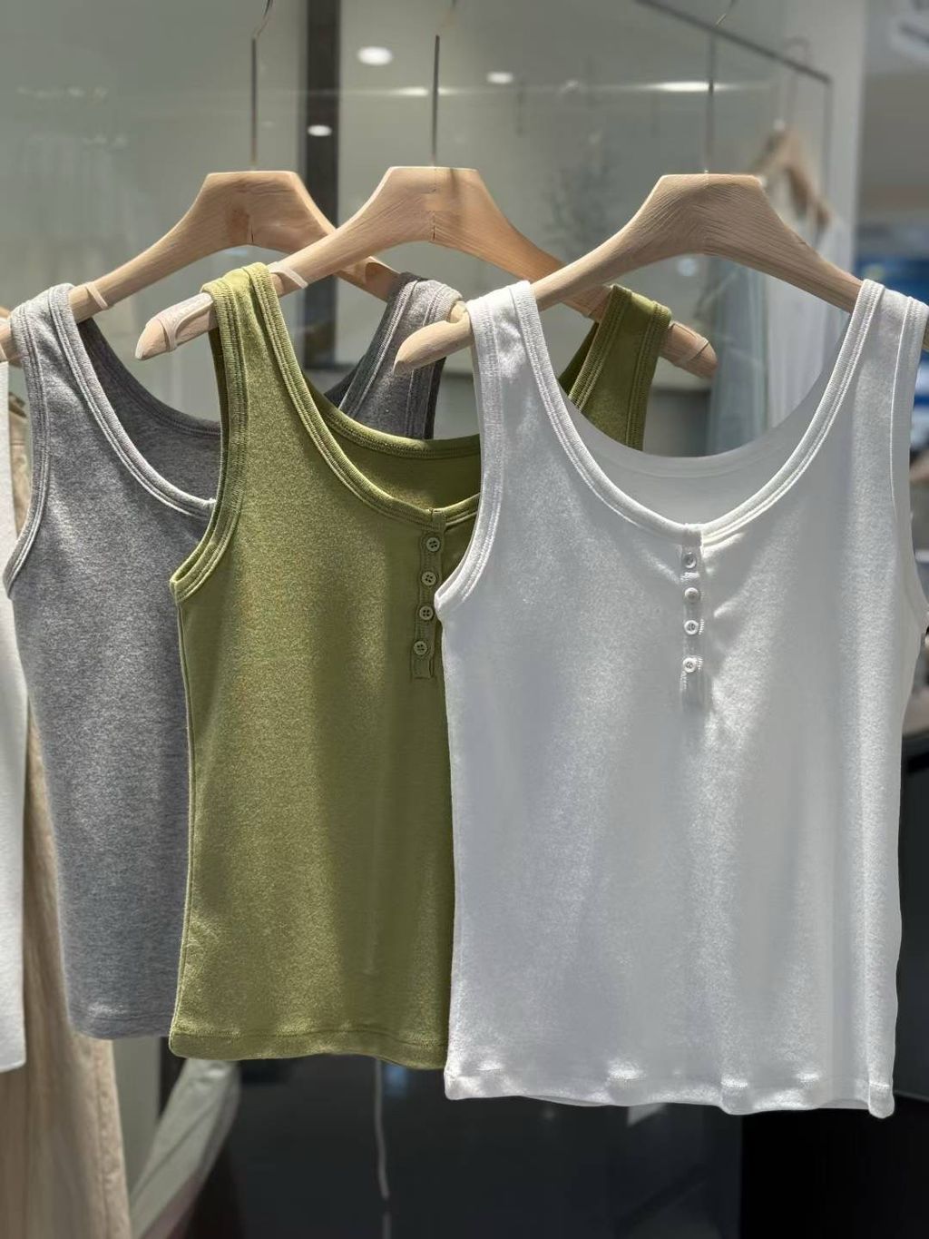 A sleeveless ribbed tank top made from soft stretch fabric, featuring a scoop neckline with button-front accents. Designed for comfort and versatility, it layers effortlessly under shirts and cardigans or stands alone as a casual summer essential. Available in grey, olive green, and white.
