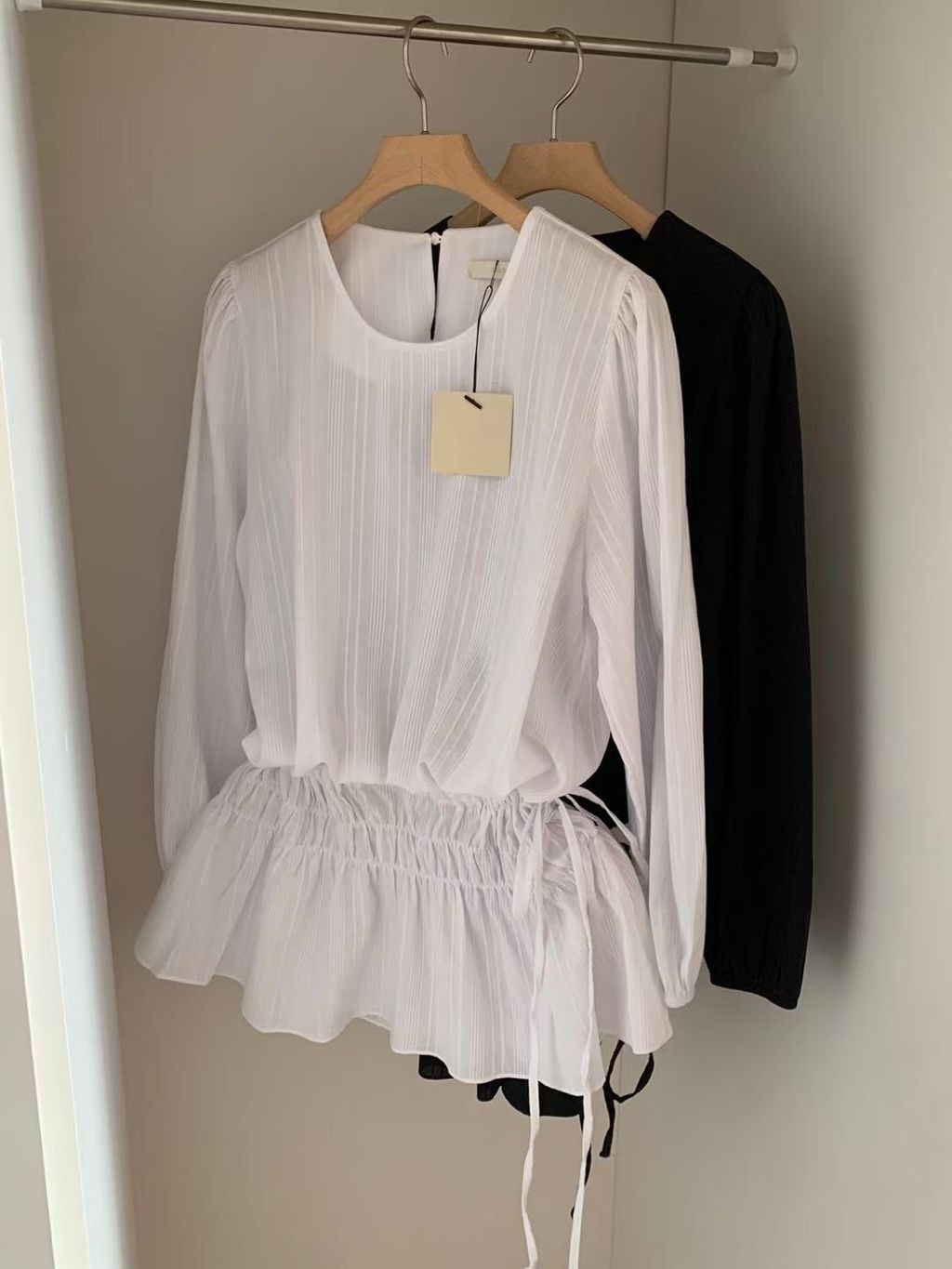 This elegant blouse features a beautifully shirred waistband that creates a flattering peplum silhouette, adding a feminine and playful touch. Crafted from lightweight, subtly textured fabric with delicate vertical stripes.The round neckline and long, slightly puffed sleeves enhance the blouse’s graceful and romantic vibe.